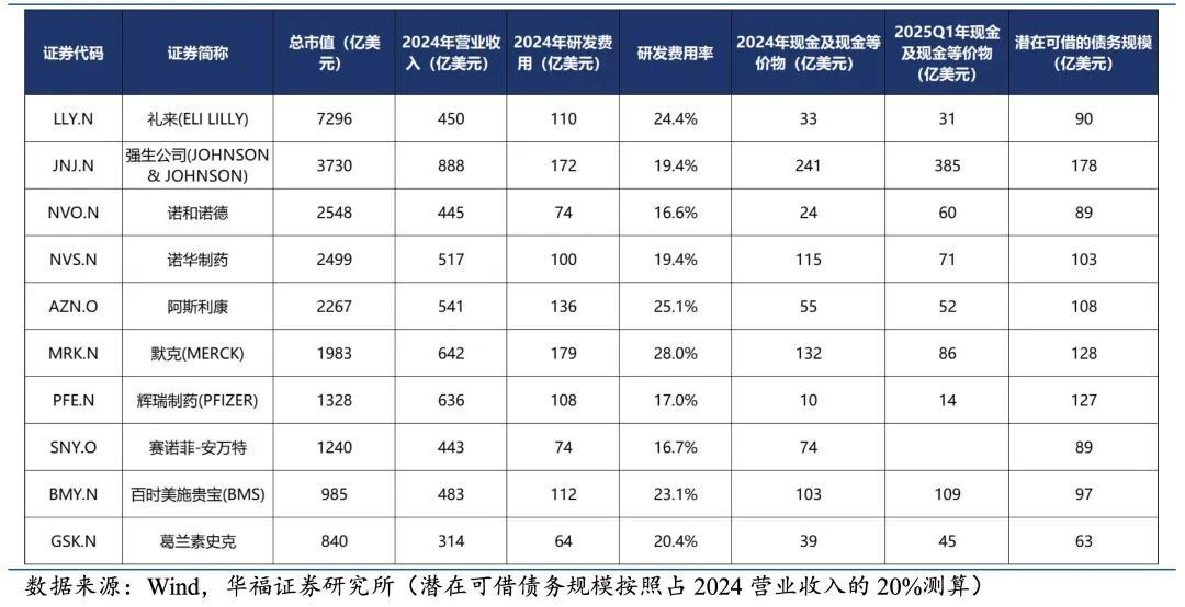MNC均有迫切寻找重磅创新药的需求,而且全是膀大腰粗的金主,年度研发费用大部分超100亿美元,现金储备+可借债务基本上超100亿美元。