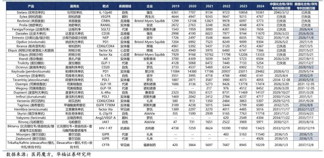 2024 年重磅药物销售情况和专利信息(百万美元)